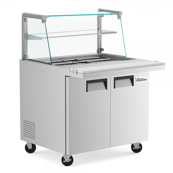 The SMB36-SGX 36inch glass top salad bar refrigerator fits 9 pans (Sold Separately) and includes a full length 8 inch cutting board included standard. Stainless steel interior and exterior for long lasting durability and easy cleaning. The 1/4+ HP refrigeration system will keep your food in the safe zone while the self-closing doors lock the cold air at 9 cu. ft. of storage offers plenty of room for storage and 2 adjustable 90 lb. shelves allow you to organize optimally. A vented stainless steel vented divider ensures your top food section and bottom storage section remain completely separate, a health code requirement in many states.