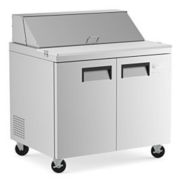 Whip up sandwiches at record pace and keep any line moving with Wowcooler SP36 36" Refrigerated Sandwich Prep Table with Cutting Board and Food Pans. Keep your food stored in the 9 cubic ft of interior space including a removable/adjustable epoxy coated corrosion resistant shelf that can hold up to 90 lbs. A vented stainless steel vented divider underthe pans ensures your top food section and bottom storage section remain completely separate, a health code requirement in many states.Featuring a heavy-duty cutting board and a sleek roll top lid which additionally can hold up to 10 x 1/6 size pans while locking in cool air ensuring your cut food stays cool in the 1/5 HP refrigeration system that keeps food at safe temperatures between 33 degrees F and 41 degrees F. The 29.5 inch depth makes it a great addition to small kitchens.